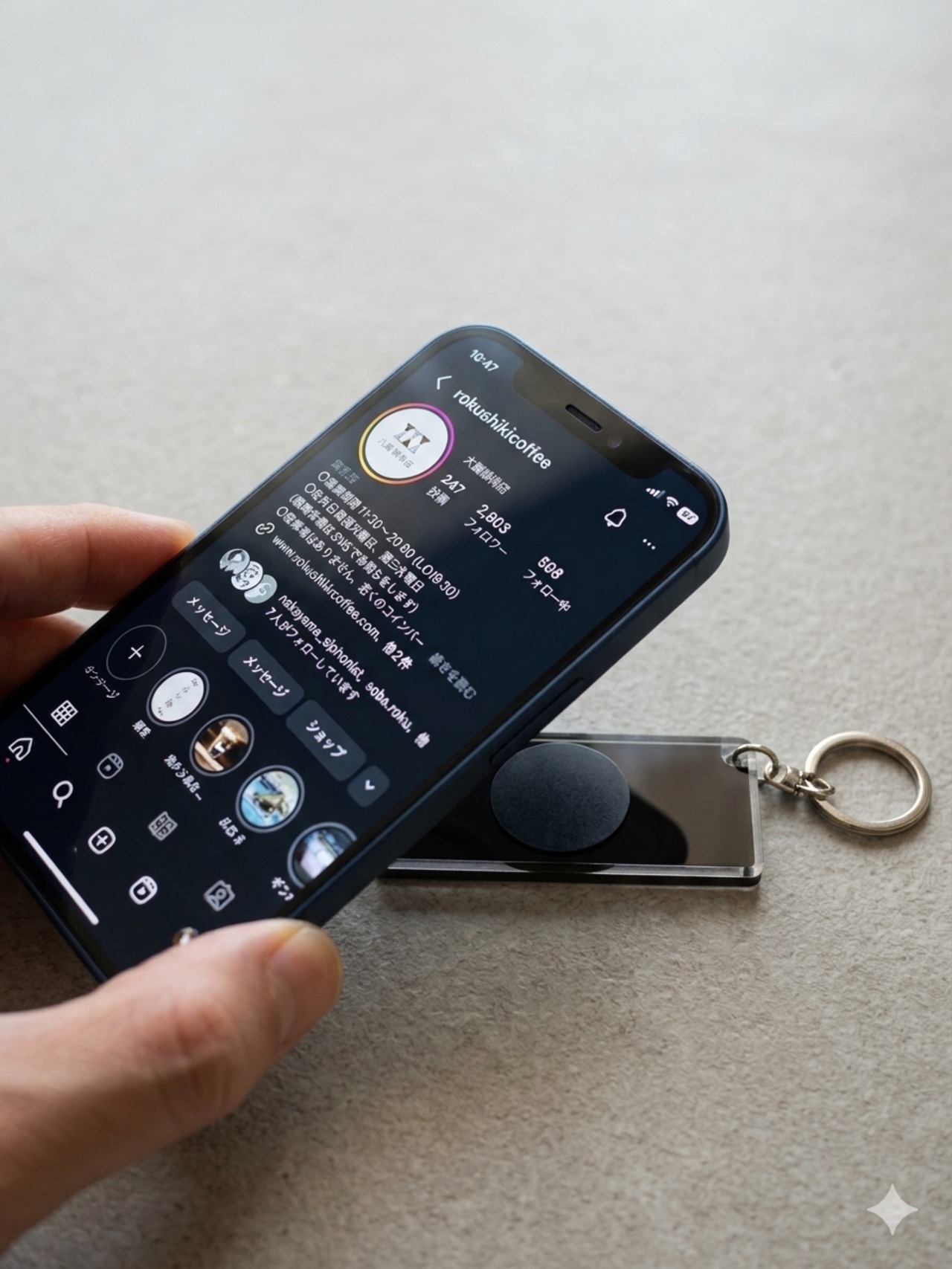 裏面のタグにスマートフォンを近づけると当店のインスタグラムに直接繋がる機能が搭載されてます。日常使いはもちろん最新情報をチェックするツールとしてもご使用いただけます。